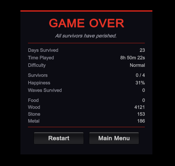 The game UI has been bugging me since Phase 1. I finally sat down and rebuilt the GameHUD from scratch — better resource display, live production/consumption rates (so you can see you’re burning through food faster than you’re making it before it becomes a crisis), and a proper notification system so the game can actually tell you things like “a horde is approaching” rather than just ambushing you silently.