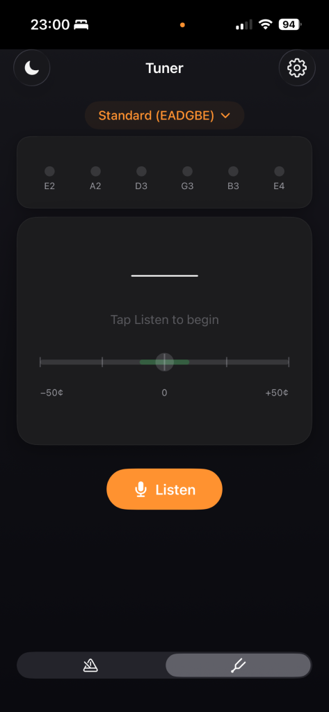 The tuner lives on the second tab and uses FFT-based pitch detection across eleven presets: standard 6-string tunings plus Drop D, Eb, D Standard, Drop C, Open G, Open D, Open E, DADGAD, and a few 12-string variations. An animated needle shows you cents deviation so you can tune accurately without squinting at a number. Low-string detection works reliably — the app checks sub-harmonic frequencies to find the fundamental even on a low E or B, which cheaper tuners often struggle with.